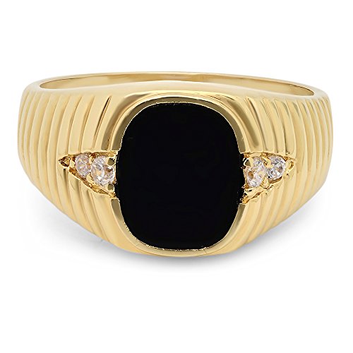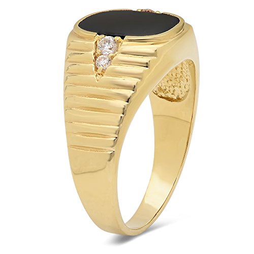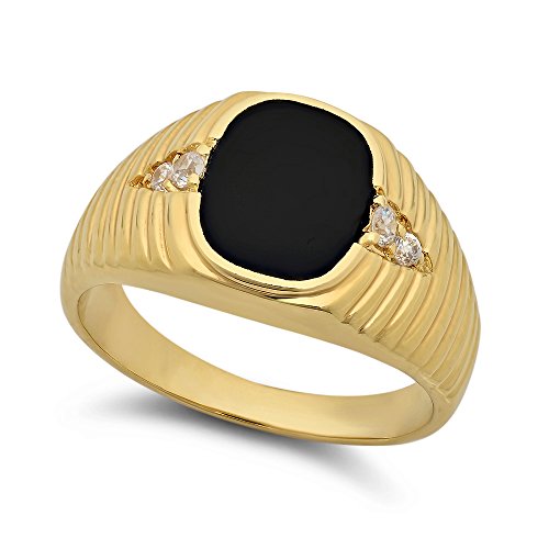 Masculine, straightforward with just the right amount of sex appeal, this men's 14k yellow gold plated ring draws inspiration from early 20th century design. With a plain midnight-black oval signet in the center, each side is flanked by two bright CZ stones and a warm golden wave design that tapers off the sides of the band. Rich brass core, 14k yellow gold layered. Made in the USA with a lifetime warranty against wear and tear.
