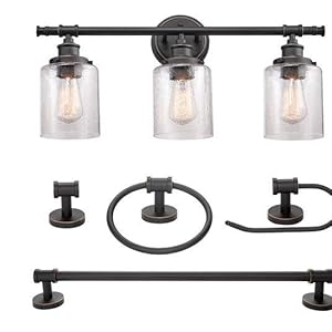 The Globe Electric 51415 Camden 5-Piece Bathroom Set combines a vintage industrial aesthetic with practical design, featuring a 3-light vanity fixture with seeded glass shades and four coordinating accessories in a bronze finish. Perfectly sized for versatile use across multiple rooms, this set offers easy installation and dimmer compatibility to customize your ambiance.