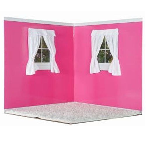 Buy American Doll Room Raspberry and White - The American Doll Room has created a lightweight, portable, and revolutionary modular Doll House. Any size doll would be thrilled to have such a great room, but it was made with18 inch dolls in mind. The American Doll Room patented design creates a realistic play area, and through it's unique Flip, Play, Fold and Carry Technology, the room can be folded flat for storage. Rooms require no assembly, so your child is able to set them up and take them down by themselves. Each room, when opened is 24 inches high, 24 inches wide, and 24 inches deep. It consists of there panels, 2 wall panels and 1 floor panel. Each panel is wrapped in a printed vinyl laminate for years of play. The reinforced hinges allow for the rooms to be opened and closed an endless number of times without the hinges wearing out. Since the rooms need no assembly, there are no small parts to lose or break. The interior of each room shows crown molding, baseboard trim, oak flooring and a view of the garden through the windows. White cotton window coverings and carpet complete the room. The exterior is finished with shutters, clapboard siding and a slate patio. Each room comes with it own purple carrying bag for fun play dates or travel. American Doll Rooms won the 2011 Top Toy of the Year in the Pretend Play category, Parents Choice Award, Dr. Toy, Best Vacation Product, and a Mom's Best Award. All Accessories and Furniture that are pictured are for ideas only. No Acessoried or Furniture are included in your room purchase.