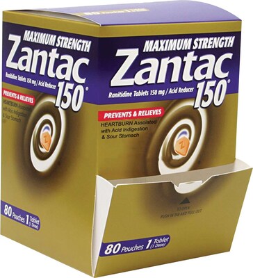 Description Relieves and prevents heartburn associated with acid indigestion and sour stomach Maximum strength antacid tablet Active ingredient: Ranitidine 150mg Can be taken 30 to 60 minutes before eating Box contains 80 dozes of Zantac One tablet relieves heartburn in as little as 30 minutes and lasts up to 12 hours 150mg per tablet Sugar- and sodium-free Specifications Pack Qty : 80 Series or Collection : Maximum Strength Antacid Type : Tablet OTC Pharmaceutical & Supplement Form Factor : Tablet OTC Pharmaceutical & Supplement Ingredient : Ranitidine OTC Pharmaceuticals & Supplements Type : Antacid Milligrams of Main Active Ingredient : 150 Brand : ZANTAC Customizable : No Weight : 1.00 lbs. per Box