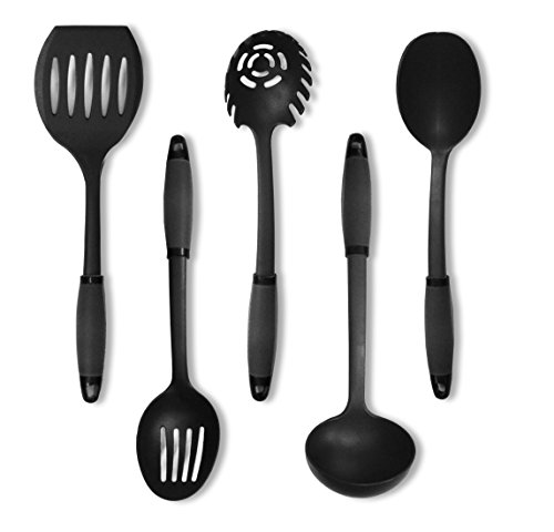 Boost your efficiency when making meals with this set of in kitchen gel grip nylon utensils. Each piece features a soft gel grip handle that is easy to hold and is available in a variety of colors. This set of 5 kitchen utensils includes a slotted spoon, ladle, spoon, spatula and spaghetti spoon. They are dishwasher safe and heat resistant up to 425 degrees Fahrenheit.
