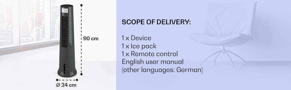 Being tower fan the footprint is relatively small. The controls are easy to use an the unit cools much more than a regular fan. However the lights are very bright, particularly in night mode when you would expect them not to be.