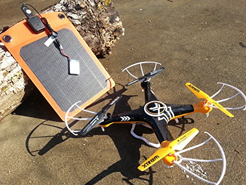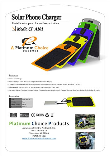 Saved by the Sun Have You Ever Found Yourself In Any of These Situations? You brought your family to the beach arriving early and staying late. Your daughter has brought her cell phone to play music and keep in touch with friends BUT then finds that her cell phone battery is low (must have been from sending all those videos of the beach to friends). She doesn't have to go home to charge her phone. Luckily you bring out your Solar Phone Charger and save the day! OR You own one of the new flying RC drones or an RC helicopter and you want to take it to the park for the day but the battery only will last for 7 minutes of flying before it needs to be recharged. Luckily you brought along your solar charger by Platinum Choice products which allows you to charge the battery back up to 100% in a little over 1 hour. More flying and more fun! New Product - First Time in USA- Introducing Direct Solar Charging • Most solar chargers on the market today charge an internal battery that will then charge your device generally only to 50 or 60%. Additional problem, the batteries get hot in the sun and fail to take a charge! Our Charger has no battery and charges your device directly. • Portable very lite (no heavy battery) just 7 ounces. • 11" x 8" solar panel generates 800mAh at 5 Volts in full sun for fast charging • Attaches to backpacks, bikes, tents, etc. with two built in grommets. • Charges Androids, GoPros, RC Batteries, cameras etc. • NOTE: Not for charging iPhones. • Just in case for those who really need to know. This SOLAR charger only works in FULL SUN.