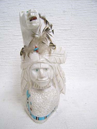 Native American Navajo Carved Marble Totem with Warrior with Bear and Eagle This wonderful totem depicts a Warrior with a Bear and an Eagle that protect him. This substantial piece by an unknown Navajo artist is beautifully carved and inlaid with bear paws and a Yei. The warrior has Turquoise eyes. The bear has Turquoise eyes and a Pipestone tongue. The eagle has Pipestone eyes and a Turquoise necklace. The artist's signature is the inlaid bear paws
