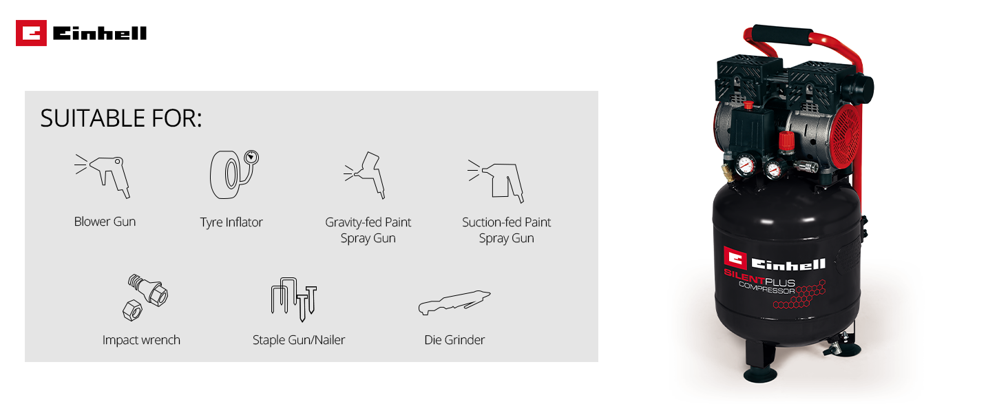 The Einhell TE-AC 135/24 Silent Plus is a compact, vertical air compressor featuring a powerful 750 W oil-free motor, delivering up to 8 bar pressure with ultra-quiet 57 dB operation. Its 24-liter tank offers ample air capacity for diverse applications, supported by precision pressure gauges, quick-release coupling, and safety features including a valve and vibration-absorbing legs. Designed for durability with a 10-year rust-through warranty, it’s the perfect blend of performance, convenience, and quiet efficiency for professional and home workshops alike.