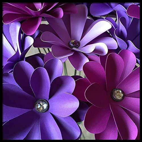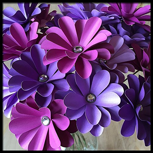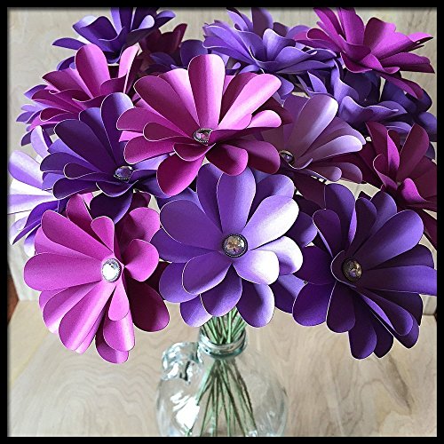 One dozen layered purple paper flowers with diamond-like centers. The stems are about 12 inches (let me know if you would like them longer) and the flowers measure about 3 inches in diameter. Three shades of purple are in this mix, but colors can be customized to your specifications. These would make a great birthday bouquet, wedding centerpiece, housewarming or hostess gift, Christmas present, etc. They also make the perfect 1st, or "paper" anniversary gift! The flowers will arrive wrapped in tissue as shown (vase is not included), with a hand lettered custom card. Please indicate the short sentiment you would like on the card at checkout.