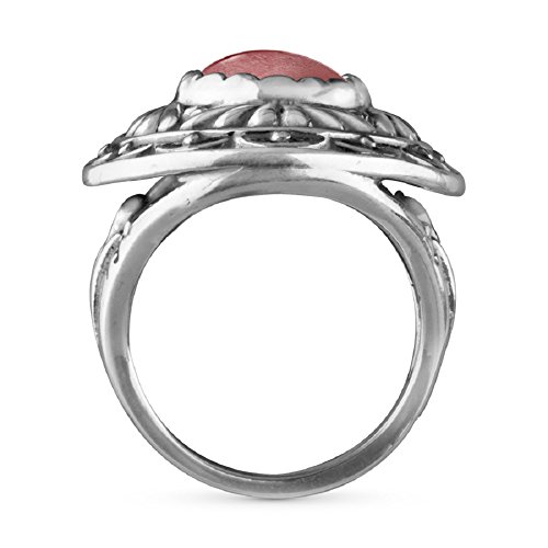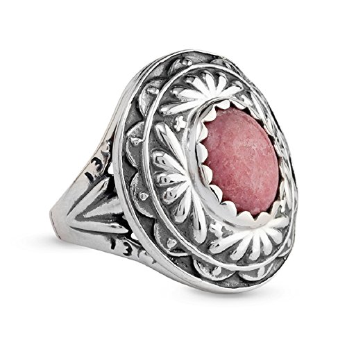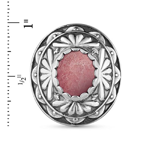 Stunning style from the American Southwest. A beautiful pink desert sunrise is captured in the unique design of this gorgeous cocktail ring. A bezel-set pink rhodonite cabochon is embraced in a classic concha design that perfectly captures the beauty of the sunrise as it emerges in the desert sky. Ring measures 1-inch long x 3/4-inch wide. *Note: Color may vary due to characteristics of the natural stone. Featuring gemstones from around the world, our jewelry is proudly made in America with US and imported parts. We do our part for the environment by crafting our jewelry from recycled .925 sterling silver.
