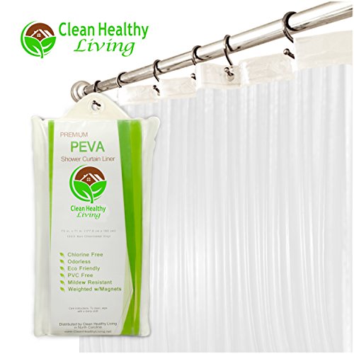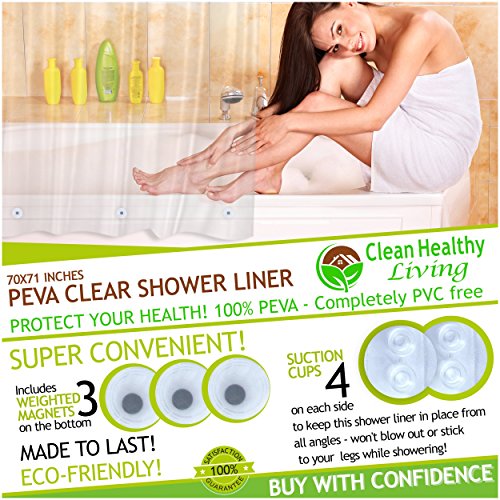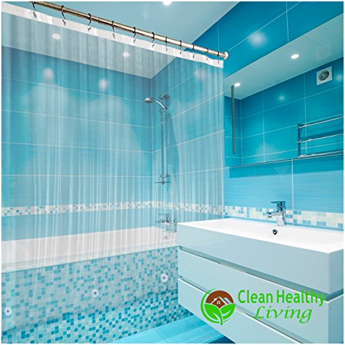 The Clean Healthy Living Heavy Duty Clear PEVA shower curtain liners are thicker and heavier. They are also non-toxic, odorless, and full of features. Order today and you'll avoid headaches from terrible plastic smells that are actually toxic. You'll keep water in your shower, not on your bathroom floor. You'll let natural light in, while protecting your shower curtain. Not only that, but you'll enjoy the extra premium features. For example, no more mildew forming on the bottom, near your feet! All liners are anti mold and include mildew protection. You'll also appreciate the rustproof metal grommets at the top and magnetic weights along the bottom to keep it from blowing around. Lastly, you'll love the 8 small suction cups to help keep it in place. Most important is the customer service you'll receive when you place your order today. All shower curtains get dirty, wear out, and will need to be replaced eventually. But we're confident ours will last longer. Give it a shot. If for any reason it's not right for you, you have 60 days to let us know and we'll give you 100% of your money back - no questions asked. Try it today. When you do, consider getting one for every bathroom, an extra one as a gift, or even just extras to have on hand to save time later. After all, try our multi-packs for extra discounts.