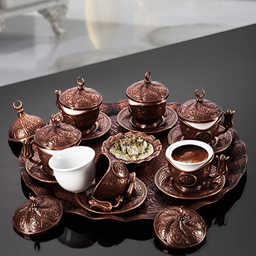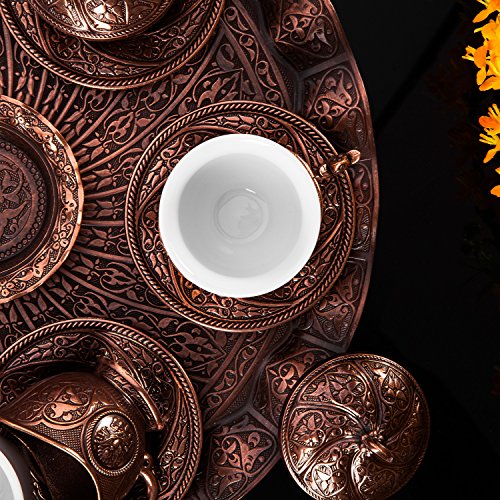 Height: Each Coffee Cup: 10 cm, Each Water Glass: 9 cm, Bowl: 10cm Diameter: Each Coffee Cup: 8 cm, Each Coaster: 10 cm, Each Water Glass: 6 cm, Tray: 25 cm, Bowl: 10cm Material: Zinc Casting / Porcelain Color: Copper Set Includes: 6 Coffee Cups, 6 Coasters, 1 Tray, 1 Bowl, Made In TURKEY