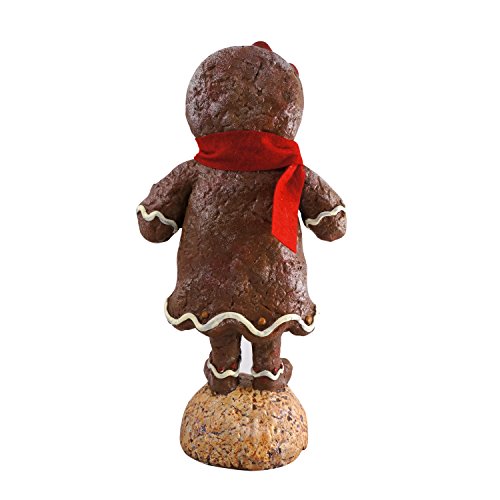 - Figure features either a gingerbread boy or girl trimmed with icing, wearing a red scarf and standing on a cookie