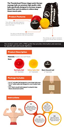 The Thunderhead Fitness trigger point therapy massage balls are premium high quality roller balls specifically designed to increase oxygen, blood flow and circulation & relieve deep tissue muscle pain.Product Features: * Three different style balls designed to treat pain points and massage specific areas of the body. * The balls are built with high quality therapeutic materials that promote relief and rejuvenation. * The carrying case makes it convenient to bring your therapy balls everywhere you go. * Our product comes with a FREE guide that provides information and exercises for specific pain and muscle tightness. Product Description: Materials: Rubber and Soft Plastic Sizes: Red Spiky Ball 3.5” diameter - Yellow Spiky Ball 2.5” diameter - Black Smooth ball 2’ diameter Package Includes: * Carrying Case * (1) 3.5” red spiky ball designed to cover larger body area * (1) 2.5” yellow spiky ball designed to cover smaller body area * (1) 2” black smooth ball designed to pinpoint deep tissue and pressure points Using Instructions: 1. Pick one of the three balls depending on area of muscle focus. 2. Using a wall or floor, place the ball between the muscle and the flat wall or floor surface. 3. Use your body weight to gently ease the ball into the muscle by making small rolling movements. 4. Experiment with the different ball styles for different muscle pain and trigger point therapyWe believe in “100% Guaranteed”. It represents our philosophy of sharing the best of times with our customers and our promise to deliver a premium therapy product to you, your family and your friends. We pride ourselves on customer service and will do whatever it takes to make you happy.