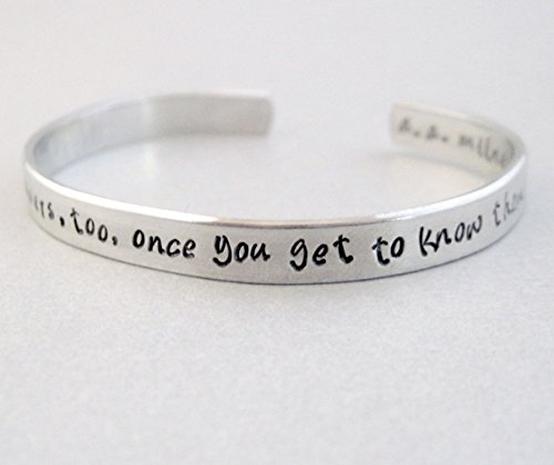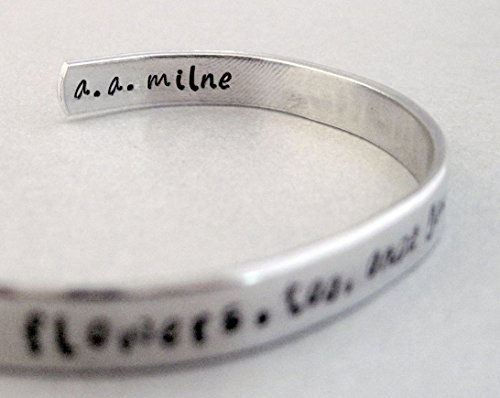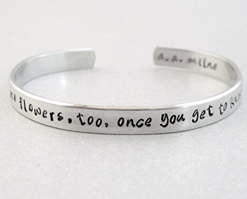 On the front of the bracelet: "Weeds are flowers, too, once you get to know them." On the back of the bracelet: A.A. Milne Hand-stamped on a 1/4" shiny aluminum cuff. Pure aluminum does not tarnish and has a much lower rate of skin reaction than sterling silver. The cuff measures 6" and is adjustable to fit nearly any wrist.