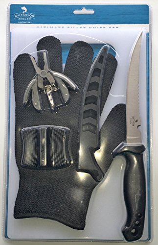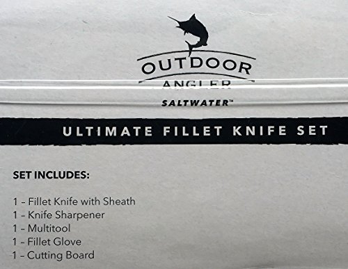 Outdoor Angler Saltwater Ultimate Fillet Knife Set makes a perfect gift for the fisherman or woman in your life. The multi-tool clips onto a belt or tackle bag and acts as pliers, small knife, file, screwdrivers, and line cutter. The ceramic knife sharpener fits neatly into a pocket or tackle bag. The fillet knife has a 6" blade, scaler, and line cutter built in. Cutting board measures 11" folded to fit into a tackle bag, and opens to 22", with handy measurements down the side for proof of that big catch!