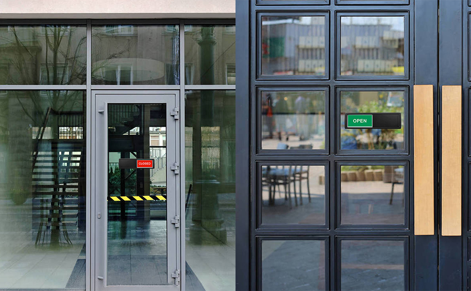This sleek 7x2 inch aluminum Open Closed Sign features a vibrant red and green dual-color design for clear visibility. It offers flexible installation with magnetic or adhesive options, requires no tools, and includes a smooth sliding mechanism to quickly indicate your business or room status. Lightweight, waterproof, and durable, it’s ideal for professional storefronts, offices, salons, and public spaces.