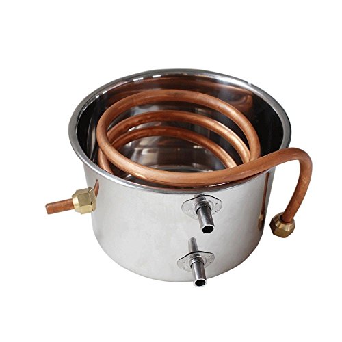 Specification: Condition: 100% Brand New Boiler Volume: 18L/5Gal Boiler diameter(Inside):30cm/11.8" Boiler height: 30cm/11.8" Cooling pot diameter(Inside):20cm/7.9" Cooling pot height:13cm/5.1" Cooling copper pipe length:185cm/57" Net weight:3.8KG Gross weight: 4.9KG Boiler Material: Stainless steel Cooling pipes material: Red copper Feature: 1.Independent airway design- allow the distillate to rise faster and delivery a higher purity. 2.Multifunction - Can be used for distilling fruit wine, distilling water, purifying water, distilling brandy,etc. 3.All stainless steel construction and welding technique - avoid any health problems associated with copper and solder constructed stills. Tips:1.Use before or after, pour 3 to 5 liter water into steaming barrel, heating and distilling half an hour to an hour, can remove residual impurities in the copper tube.(Don't add cold water into small barrel) 2. In order to avoid appear oxide. Dry barrel with towel and put it in a dry place when work finished. 3. Extra preparation needed - yeast, water supply, heat source (induction cooker or gas stove suggested) Package Include: 1. 1x Stainless steel boiler 2. 1x Thermometer 3. 1x Air valve(for fermentation use) 4. 2x 90cm silicone hoses 5. Copper cooler with stainless steel cup and copper pipe 6. English Instruction and recipe