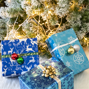 The MAYPLUSS Christmas Wrapping Paper Roll features three unique blue designs with metallic foil accents, measuring 17 inches wide by 120 inches long, totaling 42.3 square feet. Made from high-quality, tear-resistant paper, these mini rolls are perfect for small to medium gifts and versatile enough for various occasions, including Christmas, birthdays, and craft projects.