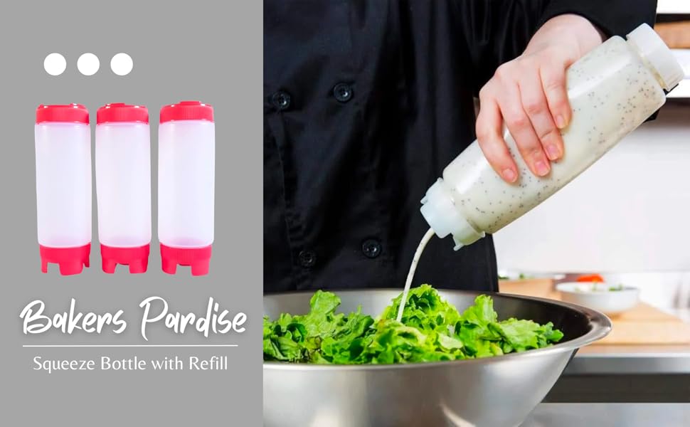 The BAKERS PARDISE FIFO Squeeze Bottle set includes three 450ml translucent, BPA-free low-density polyethylene bottles designed for professional and home use. Featuring precision dispensing tips, snap-back elasticity, and leak-proof lids, these dishwasher-safe bottles ensure hygienic, mess-free condiment management—perfect for restaurants, catering, and food trucks.