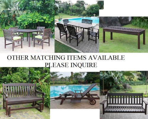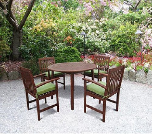 NEW 5 PC OUTDOOR PATIO DECK CHAIRS TABLE WOOD DINING Dine outdoors in comfort with this five-piece set. It is crafted from durable solid FSC certified hardwood with comfortable green cushion pads. The set includes one table and four armchairs. When fully assembled set requires a space of 10' x 10'. Assembly required I HAVE MORE ITEMS TO MATCH THIS SET, BENCH, GLIDER, CHAT SET ETC.... PLEASE INQUIRE Table: Solid FSC certified hardwood Galvanized steel hardware Wood slats using mortise-and-tenon construction Weather-resistant teak oil finish Care instructions: Apply teak oil twice a year to maintain its color Dimensions: 48" diameter x 29.25" high Chairs: Solid FSC certified hardwood Galvanized steel hardware Wood slats using mortise-and-tenon construction Weather-resistant teak oil finish Care instructions: Apply teak oil twice a year to maintain its color Dimensions: 24.25"L x 24.25"W x 34.25"H Cushion pads: Made in polyurethane foam and polyester fiber batting Attach with tie Water-repellent and UV treated spun polyester Care instructions: Brush off any loose dirt, use a cleaning solution mild soap with lukewarm water, use a sponge or soft bristle brush to clean, allow cleaning solution to soak into fabric, rinse thoroughly to remove all soap residue, allow fabric to air dry 1 YR MANUFACTURE WARRANTY
