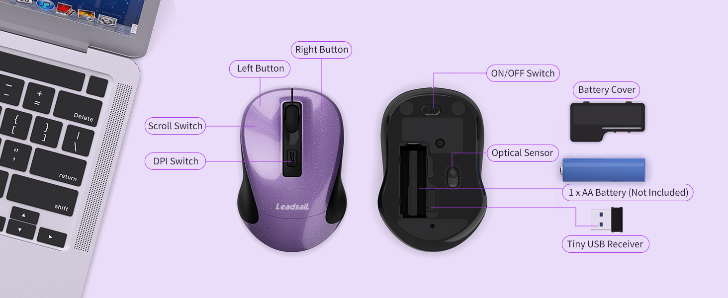 LeadsaiL Wireless Computer Mouse, 2.4G Portable Slim Cordless Mouse Less Noise for Laptop Optical Mouse with 4 Buttons, AA Battery Used, USB Mouse for Laptop, Desktop, MacBook