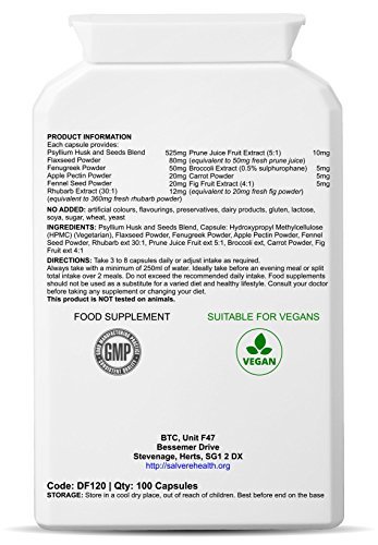 Psyllium Husk & Seeds Blend is a high dietary fiber nutritional formula in easy-to-take capsules. The fibre is derived from psyllium husks and seeds, flaxseed, prune juice, fig fruit, rhubarb, pectin and other naturally high-fibre foods and herbs. Not only will this fibre complex provide the user with a healthy combination of both insoluble and soluble fibre (essential for maintaining a healthy digestive system and bowel regularity), it will also supply an abundance of nutrients like omega 3 and omega 6 essential fatty acids, calcium, potassium and complex carbohydrates. Ideal support for regularity and a low toxic load. Psyllium Husk Capsule may help lower cholesterol levels, reduce high blood pressure, constipation relief, bowel cleanse, improve bowel movement, reduce inflammation in the body, helps lose weight fast, reduces the risk of developing hemorrhoids and diverticular disease. Salvere Psyllium Husk & Seeds Blend is Made in the UK and produced using certified GMP(Good Manufacturing Practices).