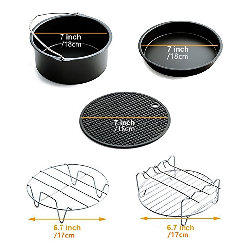Product Purpose: Cake Barrel If you are a dessert fans. The cake barrel will help you a lot. Make some delicious cake here, convenience and easy maneuverability Pizza Pan You can use it to make some pizzas, cookies and whatever biscuit you like. With the pizza pan, the possibilities are limitless Silicone Mat The Silicone Mat provides you with a heat-resistant surface to place your hot accessories on. Keep Safe. Metal Holder Maximize the cooking area. Prepare your food as desired and place one layer of food in the air fryer basket as usual. Next, place this Metal Holder on top and finally add your second layer of food on the metal grate. Skewer Rack You can put some vegetables and kabobs here. (It's Multi-Purpose Rack not only maximizes your cooking space, but it also comes with 4 skewers.) Package Includes: 1 x Cake Barrel(17.8*7.4cm) 1 x Pizza Pan(17.8*2.5cm) 1 x Metal Holder(18*18*7cm) 1 x Rack with Skewers(17*4.8cm) 1 x Silicone Mat(17.8*0.7cm) Note: 1. The non-stick coating on the pizza pan and cake barrel is not suit for dishwasher,not include uncoated parts. 2. After use, clean them with water until they cool down. 3. In case of stubborn stains, you can use sponge and hot water with detergent to clean.Do not rub with a rough cloth or metal balls.