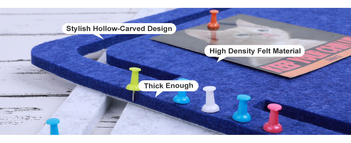 This is a large felt notice board. It’s a good thickness so the supplied push pins won’t go right through.I like that you can mount it in the wall by little stickers or remove the whole backing from the board and stick the whole thing on the wall,It comes with twenty push pins.
