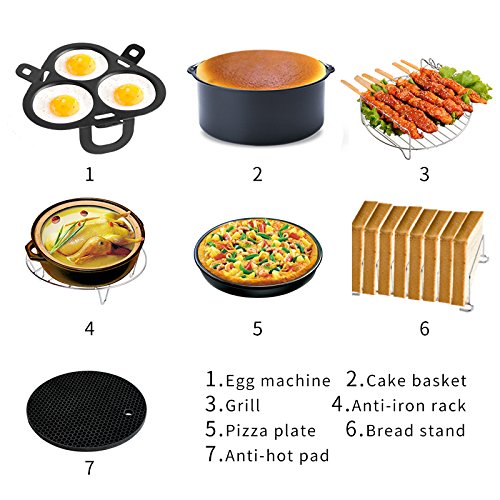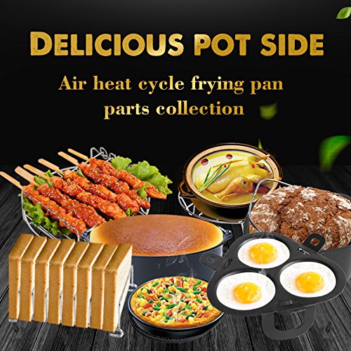 Grill, fry and cook your favorite dishes with fewer calories and maintain the same flavor and texture as a traditional deep fryer. Specifications: Material: metal + silicone Color: Black Package includes: 1 x cake keg - 1 x Pizza Pan - 1 x metal holder - 1 x multipurpose rack with skewers - 1 x silicone mat - 1 x egg machine - 1 x bread stand - Warnung: Berühren Sie das Zubehör erst, wenn sie vollständig abgekühlt sind!