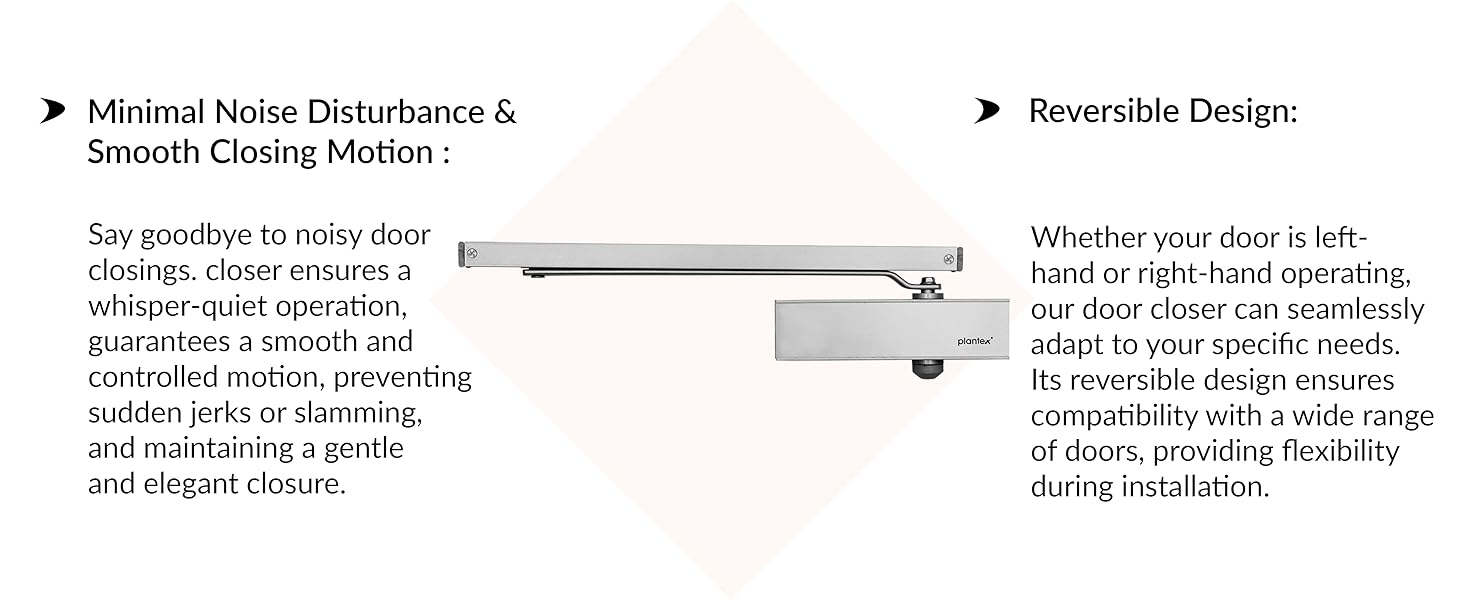 The Plantex Automatic Aluminium Soft Door Closer is a premium ISO 9001 certified hydraulic door closer designed for heavy doors up to 120 kg. Featuring a durable aluminium body, dual-speed adjustable closing, and multiple installation modes, it ensures quiet, precise door operation in homes, offices, and hotels. Its dust-resistant cover and complete installation kit make it a reliable, long-lasting solution for professional-grade door management.