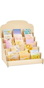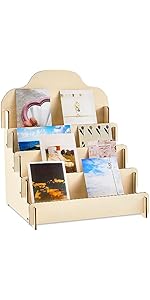 The Barydat Tiered Greeting Card Display Stand is a compact, four-tier wooden rack measuring 11.8 x 10.4 x 14.2 inches. Crafted from polished natural wood, it offers a sturdy yet lightweight solution for showcasing greeting cards, postcards, jewelry, and more. Designed for easy, tool-free assembly in minutes, this portable stand is perfect for retail, craft fairs, or personal use, combining durability with customizable style.