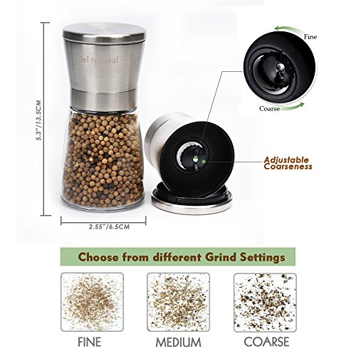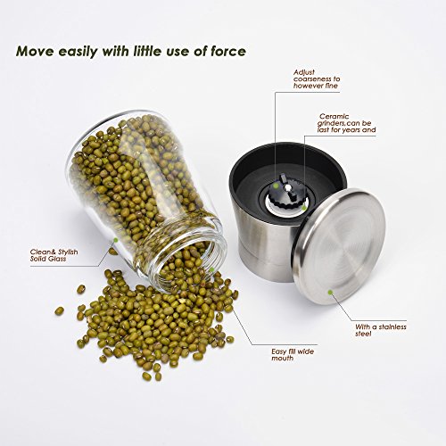 Elegant Brush Stainless Steel & Glass Design High-quality stainless steel top with glass base that allows you to easily turn and fill the grinder. Completely manual, the pepper grinder cuts the cost of batteries and will allow you to enjoy the full flavor of spices with ease. High quality ceramic grinding blade guarantees great durability and yields much healthier pepper or salt powder without metal contacts. An adjustable grinding mechanism allows you to set fineness from coarse to fine to meet your different needs in seconds. Pretty easy to use with no complicated operation at all, load the mill with peppercorns or salts, assemble it together and twist it to grind. The sealed lid also reduces moisture and other unwanted particles entering your salt & pepper mill. Specifications Material: stainless steel + acrylic; Diameter: 6.5cm; Height: 11.5cm; Package Size: 13*7*7cm; Net weight: 172g. Note Keep the mill away from children; Do not touch the underside when grinding to prevent injuries. Fill the container with salt grains or peppercorns. Do not overfill the grinder. Each set contains 2 identical mills, please note salt & pepper are NOT included.