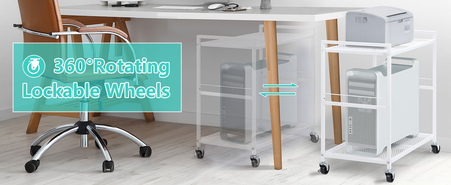 The YBING Computer Tower Stand is a sturdy, powder-coated metal cart featuring two tiers with iron mesh shelves that support up to 40 lbs each. Equipped with four 360° wheels and a locking system, it offers effortless mobility and stability. Its elevated design promotes airflow to keep your devices cool, while its sleek white finish complements modern office or home setups. Beyond computer towers, it doubles as a versatile storage solution for printers, plants, or kitchen appliances.