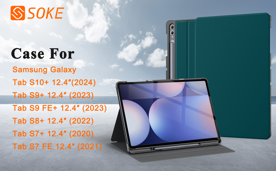 The Soke Case for Samsung Galaxy Tab S10 Plus and compatible models is a robust folio cover designed to provide full protection with a shockproof hard shell, dual viewing angles, and precise cutouts for easy access to all features. Available in a trendy teal color, it also comes with a 12-month support guarantee.
