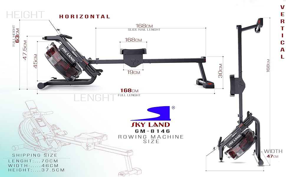 The SKY LAND Water Rowing Machine combines a sleek black chrome alloy steel frame with a 16L vertical water tank to deliver smooth, quiet resistance. Featuring Bluetooth connectivity with the Fitshow app, an ergonomic soft seat, adjustable footrests, and a compact foldable design with transport wheels, it supports users up to 130kg and 200cm tall, making it the perfect blend of comfort, tech, and space-saving convenience for your home fitness routine.