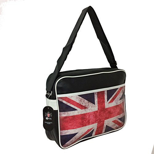 Black Vintage Retro Classic UK Flag Shoulder Messenger Bag - London Souvenir Bags BM001 Details: Looking Like A Prop. From Dad's Army This Bag Features A Faded Vintage Effect Union Jack Retro / Vintage Sports Bag with London picture and Zipped Closure. Great for carrying around Folders, Papers, Rations Perfect for School, Uni, Casually Hanging Out or Taking To The Gym! This Bag has an Adjustable Shoulder Strap, extra Back Pocket And Is A Fantastic Looking Item That Just Exudes Intrigue, Mystery This handbag is great for everyday use and would make it a great present. Style: Shoulder Messenger Bag Pattern: London Impressions Material: 100% Faux Leather Measures Approx. 36 cm x 26 cm x 10 cm
