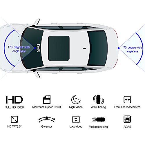 ustomer support: Lifetime warranty and free replacement accessories Product description: Purchasing our D10 1080P Full HD dash cam, you will get brighter and clearer videos, providing guarantee for your driving life. Specifications: Camera angle: 170 Degree Screen: 4" FHD screen Video recording resolution: 1080P(FHD1920x1080),720P(HD1280x720),VGA(640x 80) Snapshot resolution:1M(1280x720),3M(1920x1080),5M(2560x1920),8M(3264x2448) Storage compression mode: H.264 Video format: MOV Image format: JPEG Storage temperature: -30~70¡æ Operation temperature: 0~50¡æ Operation humidity: 15-65%RH Memory card capacity:Mamximum 32 GB Standard voltage:DC5V Features: Fashion-designed metal shell 4.0" high resolution screen 1920x1080P FHD high quality resolution 170 degree super wide angle lens G-Sensor to auto record & lock file in a collision Parking monitor Motion detection Rear camera Auto on/off with the engine 24 hours seamless loop recording USB high quality video transmission Date and time settings Replay the Recorded Video Support memory card up to 32GB Please note: It is not include mermory card(maximum support 32 GB) WDR is used for driving at night, please kindly turn off the WDR in the setting menu while you're driving in the daytime to ensure the pictures come out from the screen is still. Comes with built-in 300mAh battery, it allow you record video for 5 minutes when disconnect with the cigar lighter What You Get: 1 x Car Dash Camera device 1 x Cigar Lighter 1 x Instruction Manual 1 x 360 Degree Rotatable Windshield Suction Mount 1 x rear camera
