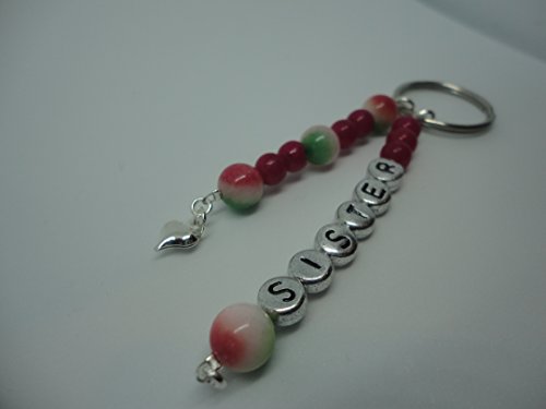Personalised Sister Gemstone Beaded Party Favour Bag Charm Keychain Other Gemstones Available This is a perfect gift for Mother's Day or a thank you gift for weddings or just a treat for yourself. Please note items may appear larger or smaller in photos, please refer to dimensions for product size. These are made using acrylic letter beads, gemstone beads and Tibetan or silver plated charms. These can be done in any gemstone. Please message us with what you require. Length - 6.5cm on 2.5cm split ring.