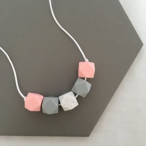A handmade, silicone bead teething necklace designed especially for Mum to wear, in a soft and contemporary colour palette of peach, light grey and granite, on a white satin cord. The BPA free beads are made from the same material that bottles and dummies are made from, so they are safe and fun for your little one to chomp away on whilst serving as a stylish fashion accessory for Mumma! What is Teething Jewellery? Teething jewellery is the must-have accessory for breastfeeding and baby wearing Mums, saving all of the skin scratching and hair pulling which is normally just a part of the job. They are also invaluable during the tough teething period, offering a safe and tactile silicone bead for little ones to chew away on and sparing all of Mum's more delicate and expensive jewellery which is irresistible but dangerous to a baby. They make great sensory aids during feeding times as they help baby with hand eye coordination and keep focus on Mums chest and they work as a great distraction to simple boredom. They'll become a staple item in any Mums change bag and are also handy on long flights or journeys. The breakaway clasps offer added safety, simply popping apart when little hands tug too hard to avoid strains on Mums neck. All necklaces are made to a standard 29 inches; this hangs low on your chest making it easy for little ones to grab and play with the beads, which are approximately 1.5cm across. If you would prefer your necklace to be made longer or shorter, please just leave a note at the checkout. The beads are all secured on the strong satin cord with knots tied at either end to help keep them in place.