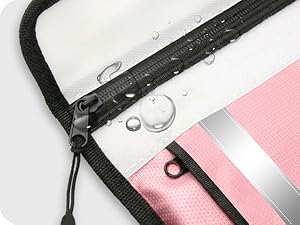 - [UPGRADED - WATERPROOF ZIPPER + ENLARGED HOOK & LOOP CLOSURE - FOR MORE SAFETY]: Compared with other fire bags with normal zipper only, our fire safe bag offers waterproof zipper (large pocket) to better protect your valuables from water. Meanwhile, the zipper for large pocket was covered by the ENLARGED HOOK & LOOP CLOSURE, which adds EXTRA safety. Together with the water-resistant NON-ITCHY SILICONE COATING FIBERGLASS, we want your valuables safe in our fireproof document sleeve