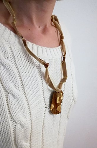 Wooden Round Shaped Pendant, Unique in its kind. Base colour of the wood, brush strokes of tempera Brick Red and applications in faux gold leaf. Bands of gold organza and brown knotted, 1 cm. This necklace is composed of a single round wood drop. The surface is characterized by small troughs and natural accents that make the varied and unique in its kind. The grey base colour is that of wood (Light Brown) on which they are present small brush strokes of color tempera Brick Red and applications in faux gold leaf. The back of the pendant is the natural colour of the wood or brown. The cord is made from a gold organza webbing and a brown, knotted between them, of 1 cm thick. The length of the necklace on each side is 12 cm, for a total of approximately 62 cm including the clasp. The organic Italian artisanal earrings Bijoux is a product line that was born for case such as are the most beautiful discoveries. Because thanks to a careful observation of nature and of its multifarious demonstrations, Daniela has worked on its natural beauty and fine has done it in no evidence sottoponendola eyes of the observer. Organic Earrings BIJOUX are earrings, necklaces, hair clip, bracelets handmade wooden, recovering the material from various types of natural plants succulenti that have suffered the natural drying process and the posting of leaves. Daniela it collects in the different type of nature, namely that material that once dehydrated it is transformed into wood (A Type often leaves and fibrous but lightweight), then select the parts and finally work every single piece manually with different tools (scissors, sandpaper, file, pliers, etc.).