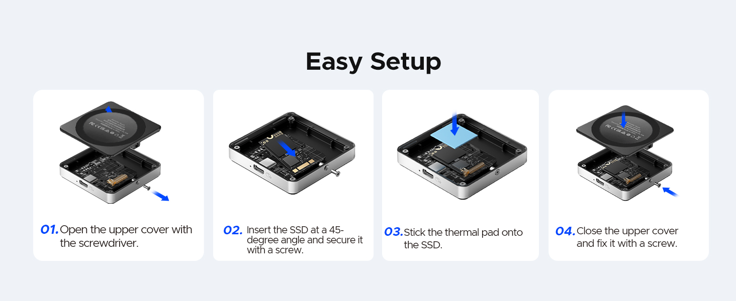 The enclosure comes very well packaged so there is no chance of damage during delivery. Once the outer packaging has been removed it poses no problem at all to remove the single screw holding the rear lid in place.They also include a nifty little screwdriver for this purpose but one that fits neatly in your hand, not some miniature version you need to hold between your fingers. This is probably the only real negative thing I have to say about the product, the size. Just like the included screwdriver, the case is much larger than it needs to be. The SSD fits perfectly fine and was easy to install but there is a lot of empty space simply for the sake of empty space thus making the device larger and thicker than it needs to be when holding it and your phone in your handThe magsafe connection works great and holds the enclosure firmly in place.One minor issue I have with this device (which you would not see under normal use with your phone) is that when you use it as an external hard drive on your other devices you notice it doesn't seal 100% and this results in a blue light shining out of the case (in my case onto my Mac Mini, thus causing me to see 2 blue lights). As stated before, the lid is held in place with a single screw so there is no way to make it seal better along an adjacent edge so I just have to live with it.TL;DR:All and all I would say it was presented very well, was very easy to inject an SSD into, sticks firmly in place on the iPhone and works perfectly well with other hardware so I have no problems recommending this product