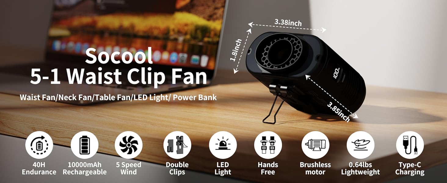 The Socool 10000mAh Portable Waist Fan is a versatile, rechargeable wearable fan featuring a powerful 5-speed brushless motor delivering up to 16000RPM airflow. Designed for hands-free use, it clips securely to your belt or can be worn around your neck, offering up to 40 hours of cooling on a single charge. Equipped with a Type-C fast charging port, USB power bank functionality, and an integrated LED flashlight with SOS mode, it’s the ultimate companion for outdoor work, travel, and active lifestyles.