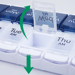 I am really really pleased with this Pill organiser. It is so well designed and easy to use. The whole top lifts off - just a clip either end and it's off - to give you 14 easy to fill partitions. Clip the whole top back on again and you have very clear large lettering ( unlike this RIDICULOUSLY SMALL lettering that I need the Hubble Telescope to read what I have written - get your act together Amazon) giving you two colours of easy to use Flip Up Lids for AM/PM.. Altogether a superb product - at a super value price. Thank you Amazon.BUT DO SOMETHING ABOUT THIS RIDICULOUSLY SMALL LETTERING - OR I'M NOT GOING TO WRITE ANY MORE REVIEWS FOR YOU - UNLESS YOU PAY ME.