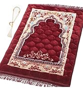 The YAZEIN Muslim Prayer Rug is a premium, machine-made cotton blend mat measuring 31.5" x 47.2" with a dense velvet surface and thick cotton padding for superior comfort. Designed with anti-skid backing and elegant Islamic motifs, it includes Tasbih prayer beads and is machine washable, making it a durable, stylish, and practical choice for men and women seeking a serene prayer experience.