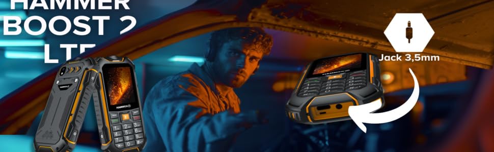 The HAMMER Boost 2 LTE is a SIM-free rugged mobile phone featuring a durable IP68 and MIL-STD-810H certified design, a 2.4" IPS screen with backlit keys, dual SIM 4G LTE with VoLTE, and a powerful 3500 mAh battery offering up to 25 days standby. Engineered for professionals in demanding environments, it combines long-lasting performance with practical extras like an LED torch, FM radio, and Bluetooth connectivity.