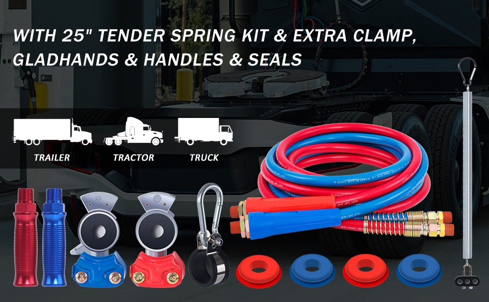 The CheeMuii 12 FT Semi Truck Air Line Hose Assembly is a DOT and SAE compliant, premium-quality air brake hose kit featuring a durable 3-layer double-braided design, color-coded red and blue hoses for easy identification, and 360° swivel brass fittings with leak-proof sealant. It includes a galvanized carbon steel spring and ergonomic rubber handles to prevent kinking and ensure long-lasting performance under heavy-duty conditions.