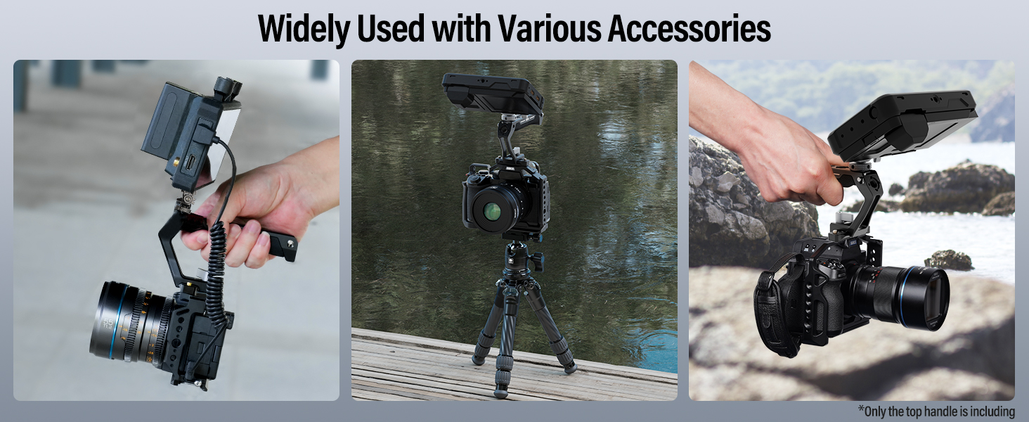 The SIRUI NATO Top Handle SC-TH is a lightweight yet ultra-durable aluminum alloy camera handle featuring a non-slip silicone grip. It supports up to 22 lbs, offers quick tool-free attachment via NATO rail, and includes 3 cold shoe mounts with anti-shedding pins for versatile accessory setup. Multiple 1/4" and 3/8" ARRI threaded holes ensure compatibility with a wide range of professional camera gear, making it an essential upgrade for dynamic, low-angle, and handheld shooting.