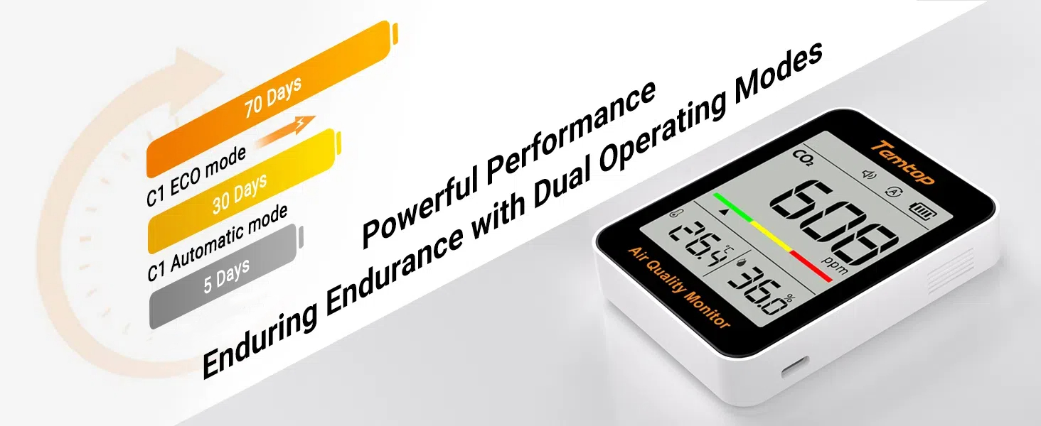 The Temtop CO2 Monitor is a compact, portable device that tracks indoor CO2 levels (400-5000 PPM), temperature (-10 to 60°C), and humidity (0-99% RH) in real time. Featuring an advanced optical acoustic sensor and intelligent algorithms, it offers up to 70 days of standby time. Its user-friendly design includes customizable alarms, color-coded alerts, and a sleep-friendly mode, making it ideal for home, office, or school environments seeking affordable, reliable air quality monitoring.